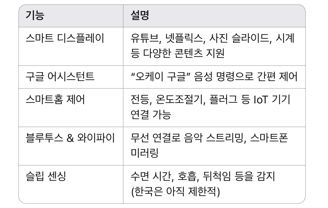 구글의 스마트 디스플레이 기기로, 7인치 터치스크린과 강력한 음성인식 기능을 갖춘 제품입니다.